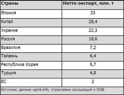 В 2011 г. на позицию крупнейшего экспортера стали в мире вышел Китай (почти 49 млн. т), опередив пострадавшую от Фукусимской трагедии Японию (41 млн. т). На 3-й позиции – Евросоюз, внешние поставки из которого выросли на 11%, до 36 млн. т. На 4-е место поднялась Южная Корея с показателем 28,5 млн. т (+9% к уровню 2010 г.), на 5-е, соответственно, опустилась Россия, экспорт которой за 2011 год сократился почти на 5 млн. т. На 6-й позиции – Украина (24 млн. т), в погоню за которой устремляется амбициозная Турция, поставившая за цель выйти на 20 млн. уровень стального экспорта уже в 2012 г.