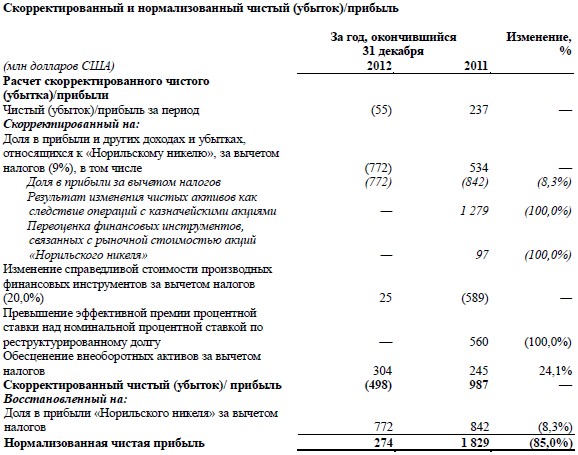 Скорректированная чистая прибыль за любой период определяется как чистая прибыль, скорректированная с учетом чистого эффекта инвестиции компании в ГМК "Норильский никель", чистого эффекта встроенных производных финансовых инструментов, превышения эффективной процентной ставки над номинальной процентной ставкой по реструктурированному долгу и чистого эффекта от обесценения внеоборотных активов. Нормализованная чистая прибыль за любой период определяется как скорректированная чистая прибыль плюс эффективная доля компании в "Норильском никеле".