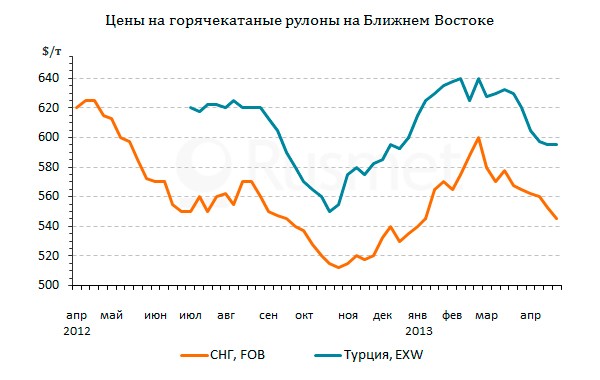 Тем не менее, по сравнению с соседними странами экономика Турции выглядит вполне благополучной, поэтому местный рынок стали привлекает поставщиков со всего региона. В частности, румынское подразделение Arcelor Mittal предлагает горячекатаные рулоны в Турцию по $600-610 за т CFR. Российским и украинским компаниям, чья продукция облагается пошлиной в размере 5-9%, приходится опускать котировки гораздо ниже. В конце апреля стоимость украинских горячекатаных рулонов с поставкой в мае упала до $530-540 за т FOB – минимального уровня с начала января текущего года, а российские компании сбавили цены до $540-560 за т FOB. Холоднокатаные рулоны украинского производства, при этом, котируются в интервале $615-625 за т FOB, аналогичная российская продукция, как правило, продается не более чем по $630 за т FOB.