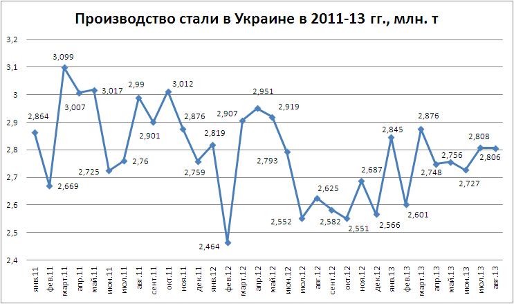 В августе текущего года выплавка стали снизилась по сравнению с июлем на 0,1%, до 2,806 млн. т, но по сравнению с июлем 2012 г. выросла на 6,9%.